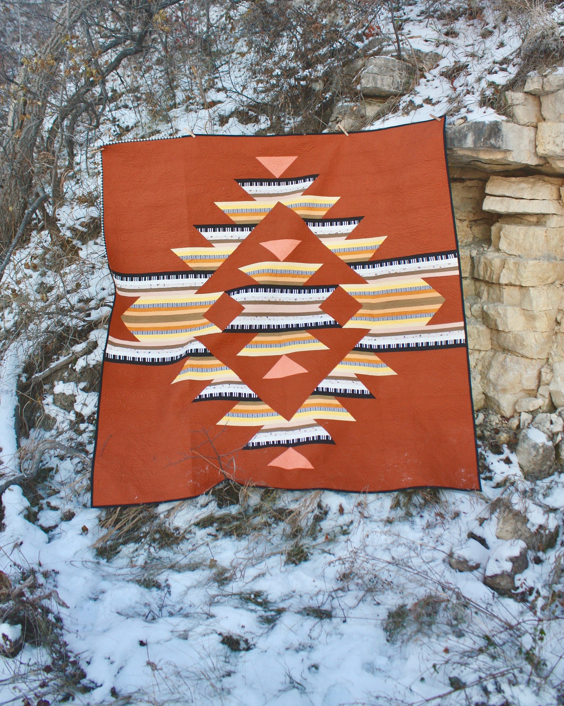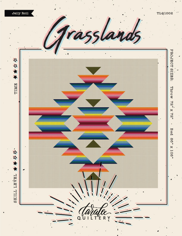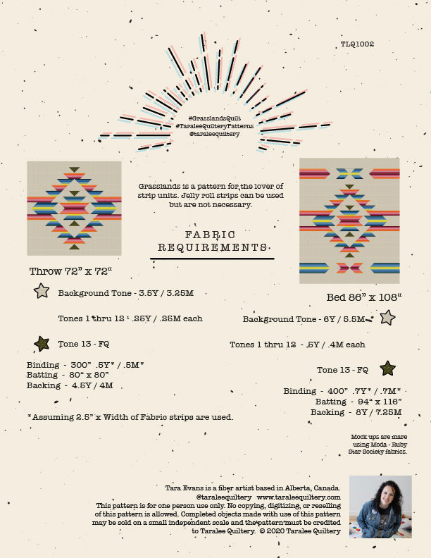 Grasslands is a pattern like no other. It's striking, unique and well written. It includes instructions for a Throw (72" x 72") and Bed (86" x 108") size. Coloring pages and detailed cutting instructions are included. Please see the second image for fabric requirements. This pattern is considered an intermediate level.